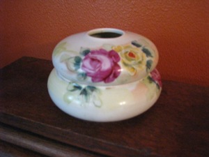 Description: Beautiful old hand painted china hair receiver. Sold as is There is a chip on the inside lip of lid.