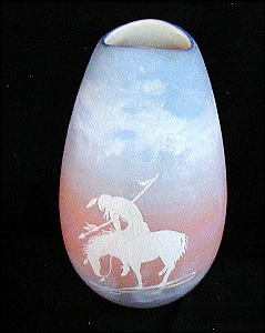 Description: SIGNED NATIVE AMERICAN POTTERY VASE, ovoid form with silhouette of man on horseback on one side, and profile of a man on the other, signed Rosebud Sioux Pottery, S. Oliver. Height 10 inches.