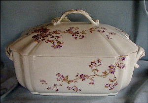 Description: Large tureen with cover. Porcelain with decorative purple floral sprays. Limoges, France.