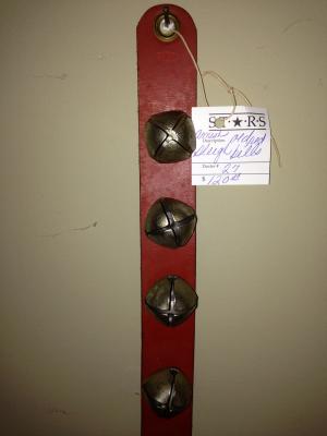Description: Amish made sleigh bells on red leather strap, from Angelica New York