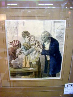 Description: A hand colored etching, appeared in Harper's Weekly Magazine, c 1885. Titled "Vaccinating the Baby" from a sketch by Sol Eytinge. Matted, framed under glass.