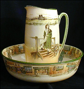 Description: A wonderful Royal Doulton pitcher and basin bowl set. Dickens Ware series, this set features Sydney Carton and scenes from "A Tale of Two Cities".