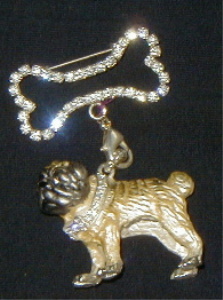 Description: Several different dog breed pendants are in the case now. They dangle from a fun rhinestone bone-shaped pin. Case #4 on the front aisle.