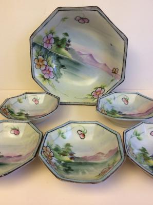 Description: Antique Japanese Porcelain Enamel Set of 6 Rice Bowls with hand painted Mountainous Landscape,Pagoda and the Sea. Manufactured by Takito company between 1891 - 1921,marked "Nippon" on the back. The set consists of a large bowl,9 1/4 Dia and five smaller bowls, 5 1/4" Dia. In a very good condition for the age.