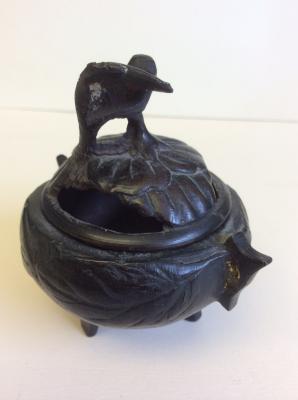 Description: Antique Japanese Bronze Incense Burner with Leaf Design on the Top and Around, Meiji Period. Hand cast in perfect condition. Small size 3"H x 2.5" W