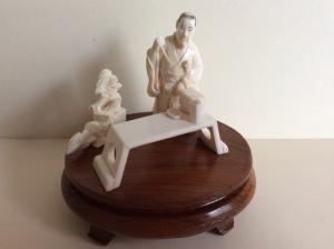Description: Antique Japanese Natural Ivory Netsuke on wooden stand featuring chef making dinner. Very good condition, no cracks on the Ivory, just one can see beautiful texture of the natural material.
