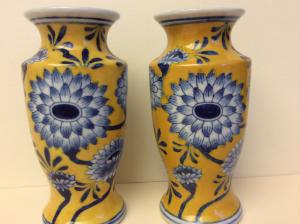 Description: Antique Chinese Doucai Porcelain Pair of Flower Vases decorated in the Ming style with Doucai technique, circa 1920. Vases are featuring Dahlia Flowers and performed with stunning combination of Blue over Yellow color background. This color combination was invented during Ming Dynasty Period and since is associated with Ming. Doucai technique of painting considered to be very careful, skillful and precise. In other words - top of the line. Doucai translates " Colors which fit together". This vases also carry certain meaning. Dahlia flowers symbolize commitment and bond that lasts forever. Very elegant vases with beautiful Dahlia design .