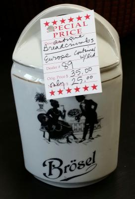 Description: In great condition is this container which held bread crumbs. Priced to sell, under $30. From Europe. In good shape.