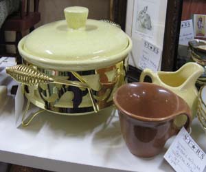 Description: Classic Yellow speckled Bauer Casserole in the original brass colored holder. Very good condition.