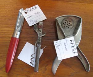 Description: New kitchen items added to a large variety of vintage utensils. Prices vary from about 4.95 to 18.95 depending on condition and scarcity. Painted and Bakelite handles as well as metal items.