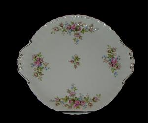 Description: Royal Albert Moss Rose Cake Plate with handles approx. 10" D. Located in Case #4 on the front aisle.