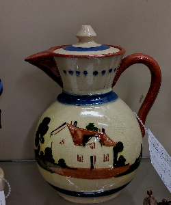 Description: Motto ware teapot with cabin design. Located in Case 34 on the front aisle.