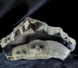 Description: Swedish crystal etched with design of baby seals by artist Mats Jonnason. Made in Sweden. Artist signed. Approx 8" length. Excellent condition.