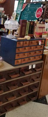 Description: Restoration by Kathleen, this multi-drawered antique cabinet would lend itself nicely to be nestled next to a chair or sofa keeping neccessary items organized & out of sight i.e., remotes- personal items-pencils-pens- glasses-stamps-cords-chargers & soooooooó much more. Or place in art room, sewing studio, office, kids rooms for smaller toys. Enjoy this 1930-40's one of a kind cabinet found locally. ☆