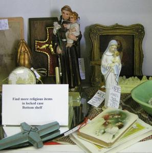 Description: A nice selection of religious items to chose from. Included are rosaries, holy cards, crucifixes and other Catholic items from the 1950's and 1960's.
