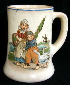 Description: An early Roseville creamware stein featuring Dutch children and some PORTLAND HISTORY! Advertising for Paul's Cafe on E. Burnside at Grand.