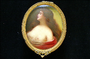 Description: Beautiful antique ring box or trinket box features a porcelain cover with hand painted portrait. Hinged lid and velvet interior.