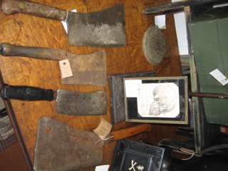 Dealer #70 has a creepy tabletop display of rusted hatchets.
