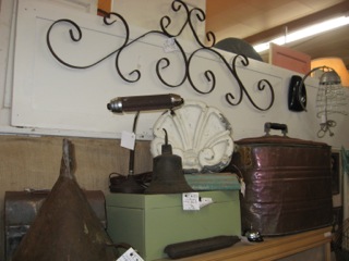 Dealer #74 has a simple display that packs a punch! A copper boiler, funnels and decorative architectural pieces intermix on a top shelf and have a fall-ish feel.