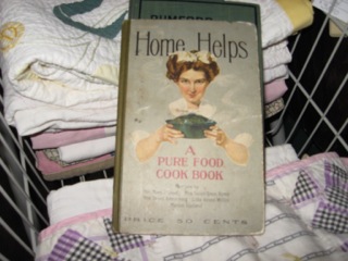 Dealer #24 has this charming vintage cookbook with wonderful artwork on the cover! Cozied up in a bin of vintage linens and cloths let's flip through and get some ideas.