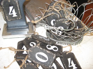 The numbers game is easy when you see how simple displaying collectibles can be. Stars Too has white stenciled numbers on black board hanging from jute. Remember that three of the same item makes a collection!