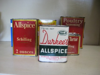 Vintage spice tins in different shapes and colors from Dealer #35 intermix together for a fun primitive look.