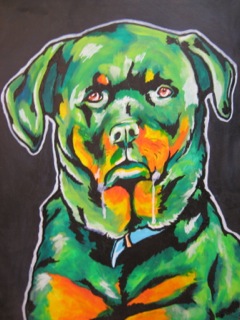 Dealer #153 has a passion for dogs! A bold and striking portrait rests on a braided rug in her space.