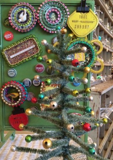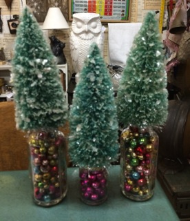 Dealer #88 fills small jars with ornaments and tops them with vintage trees.