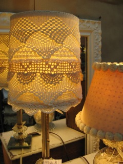 Dealer #30 has a soft take on lighting up a room. Remnants of lace and vintage trims create a subtle glow in tone on tone ivory for vintage glass and metal base lamps. These never last long!