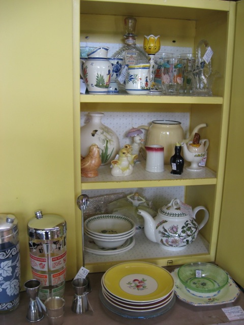 Dealer #48 has a bright yellow cabinet filled with kitchen items. Clear the cupboards, get like items together and create a fresh look with what you love.