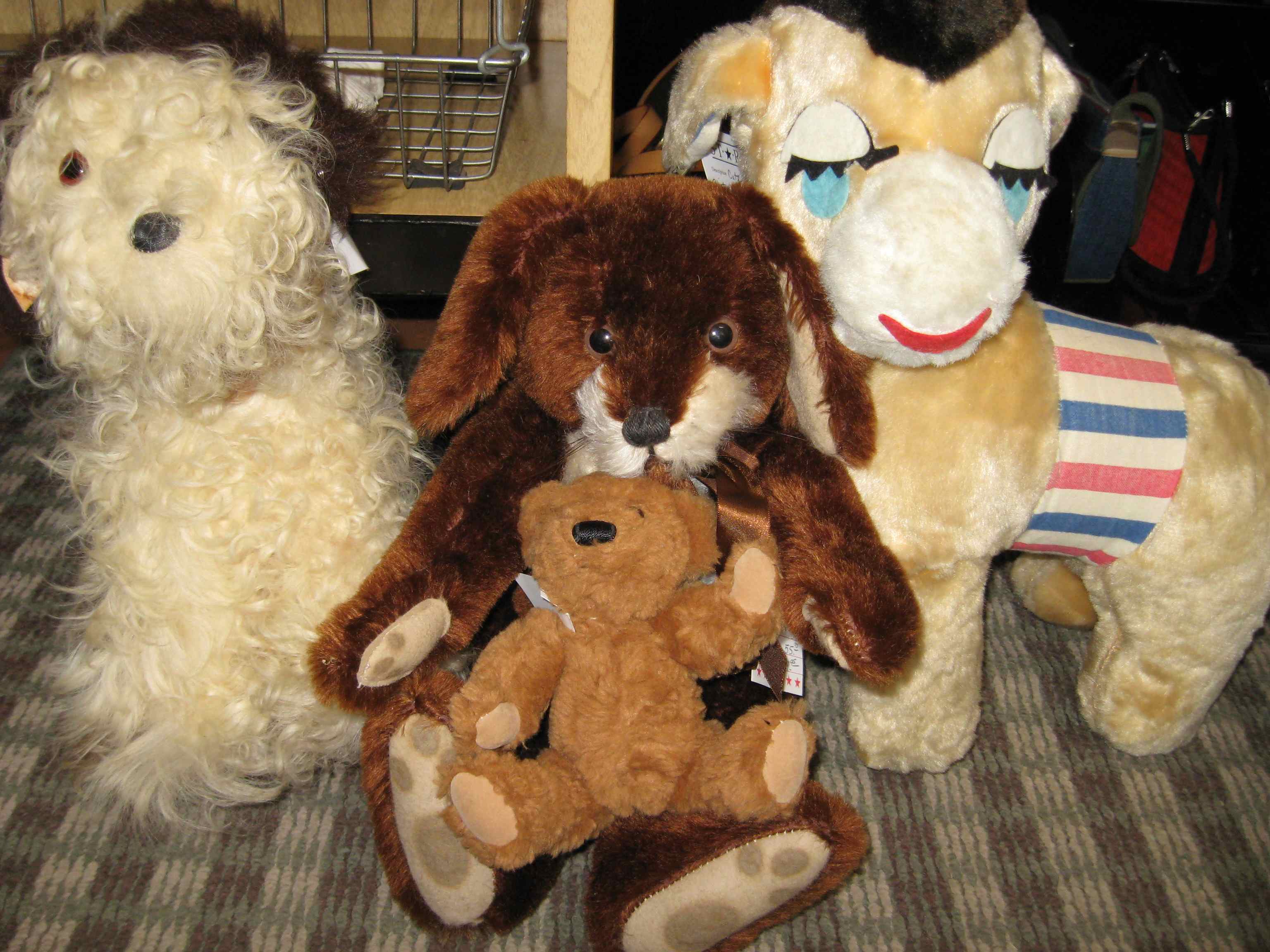 The crowd of stuffed toys on the bed and shelves make it hard to select the perfect four for inviting to tea! Dealer #48 has critters of all shapes in sizes in her space nesting in baskets and sitting in displays.