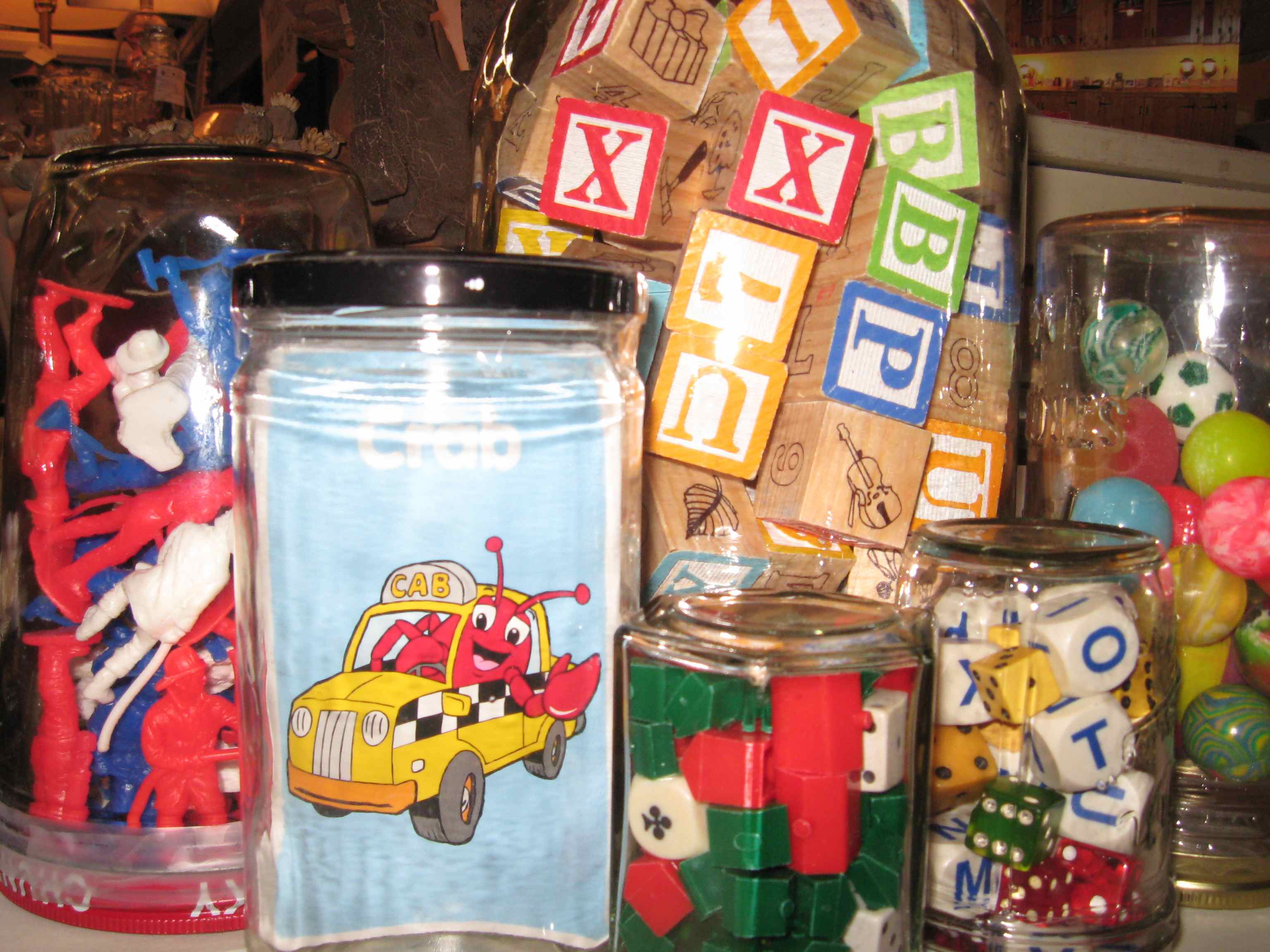 From wooden alphabet blocks and chess pieces to red, white, and blue firemen and monopoly houses complete with dice, Dealer #60 has a variety of jars that give a clear view of what's inside. Have you ever seen a crab drive a cab??