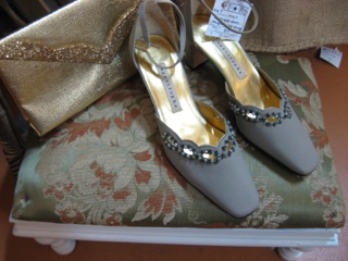 It's not complete until you've selected the proper accessories. Simple gold clutch and evening shoes from Dealer #87.
