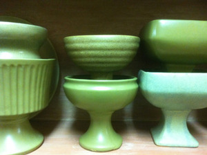 All this green pottery and no more shelf space to put it. What are we going to do? Came to shop in Dealer 99's space and were confronted with a whole collection of this lovely green matte pottery. And we want it all. Priced at $10 to $20 each, this would your chance to start an instant collection.
