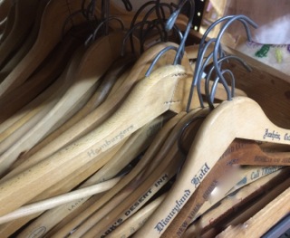 Dealer #54 fills a bin with old wooden hangers complete with advertising.