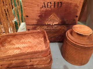 Stacked baskets and clay containers from Stars Too add texture and color play.
