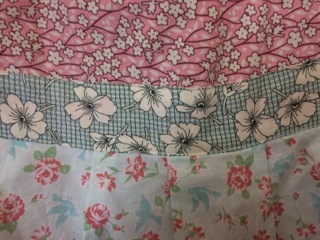 Detail shot of sweet child's dress with contrasting panels of floral prints. Available from Dealer #64.