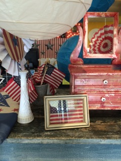 Fill the entryway with a mix of patriotic items in the colors of the day. Vignette at Stars Too.