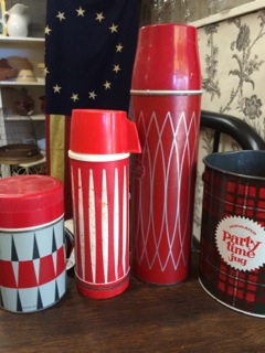 Thermoses are lined up in front of Old Glory in the space of Dealer #74.