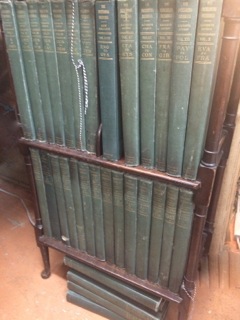 A wealth of bound books fill a small vintage shelf; to read or simply display from Dealer #99.