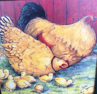 Dealer #30 has this wooden plaque with hens and chicks perfect for the sun room or the interior wall of the coop.