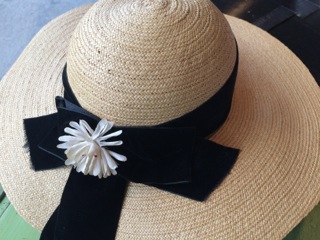 A simple hat gets a black velvet ribbon with a crisp white daisy. Available from Dealer #17.