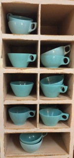 Vintage aqua cups nest and stand alone in an upright cubby from Dealer #79.