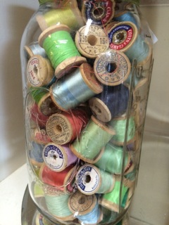 Dealer #79 sorts out the small wooden spools and fills a jar!
