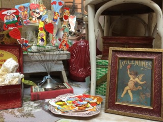 Romance flourishes in the space of Dealer #38. Vintage Valentines, frames, and more create a lovely vignette.