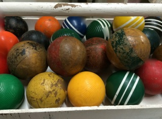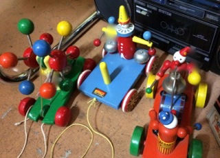 Break away from the daily routine of a push and pull existence and experience how wonderful change can be! Vintage pull toys with wooden spheres from Dealer #156.