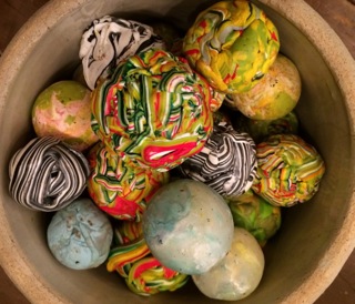 Colorful fimo clay balls fill another bowl just waiting to be tossed. Available at Stars Too.