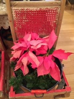 A worn and weathered chair at Stars Too holds a pale red poinsettia which will flower into the spring with proper care!