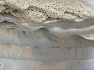 Tone on tone ivory shams, throws, and blankets from Dealer #35.