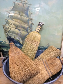 Bowl of whisk brooms in front of a lovely piece of art; let's whisk away the cold and snow and move into better days! Available from Dealer #25.